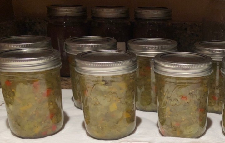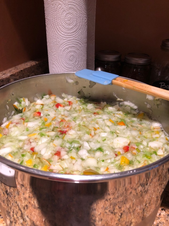 Once the relish is simmering- put your lids and rings in a bowl with some boiling water – enough so it covers everything. Then put the jars in the water bath and boil for a good 10 minutes.