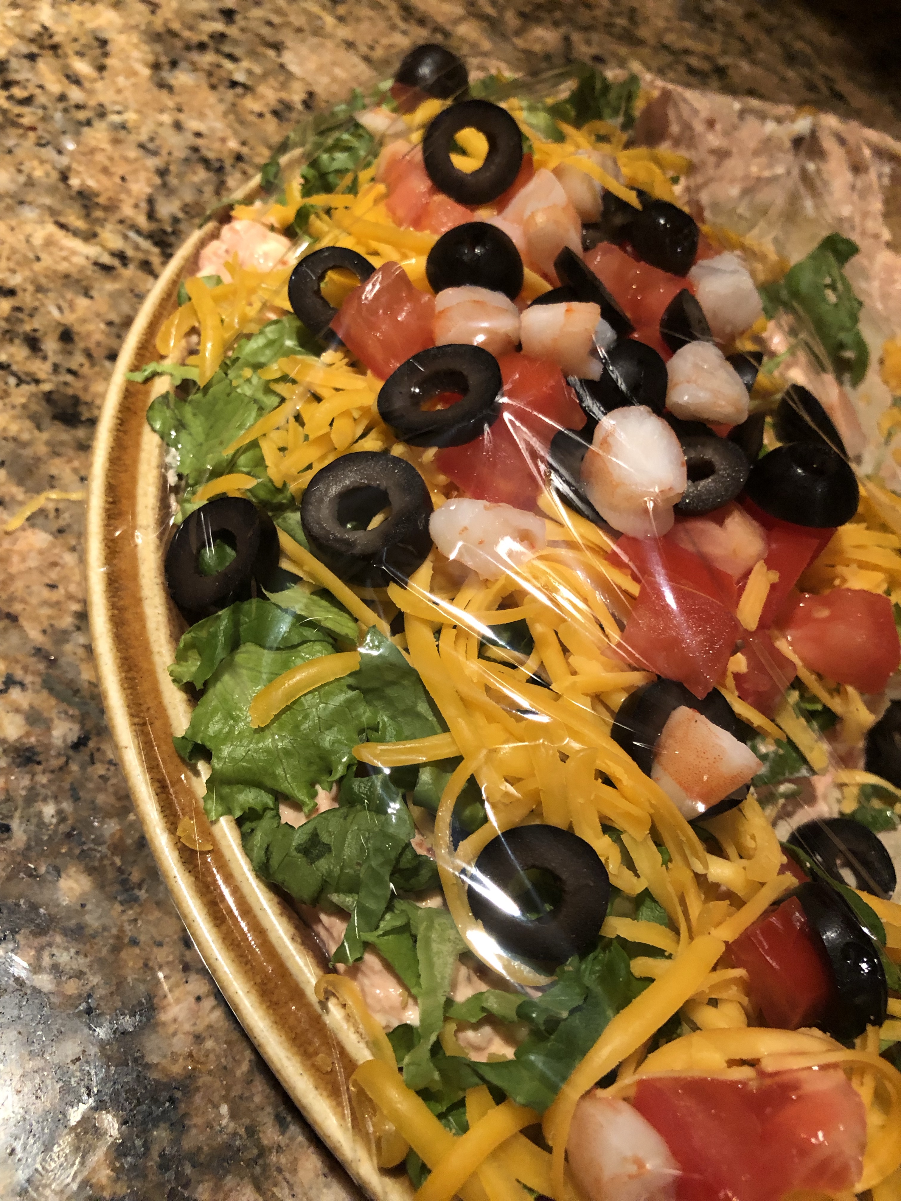 Wanted something different for dinner and have been craving taco dip for quite some time. Decided it would make a nice Friday dinner. Please excuse the plastic wrap- this is actually our leftovers. Haha hunny- can you believe he asked me if a ‘taco dip’ would be enough for dinner… lmao