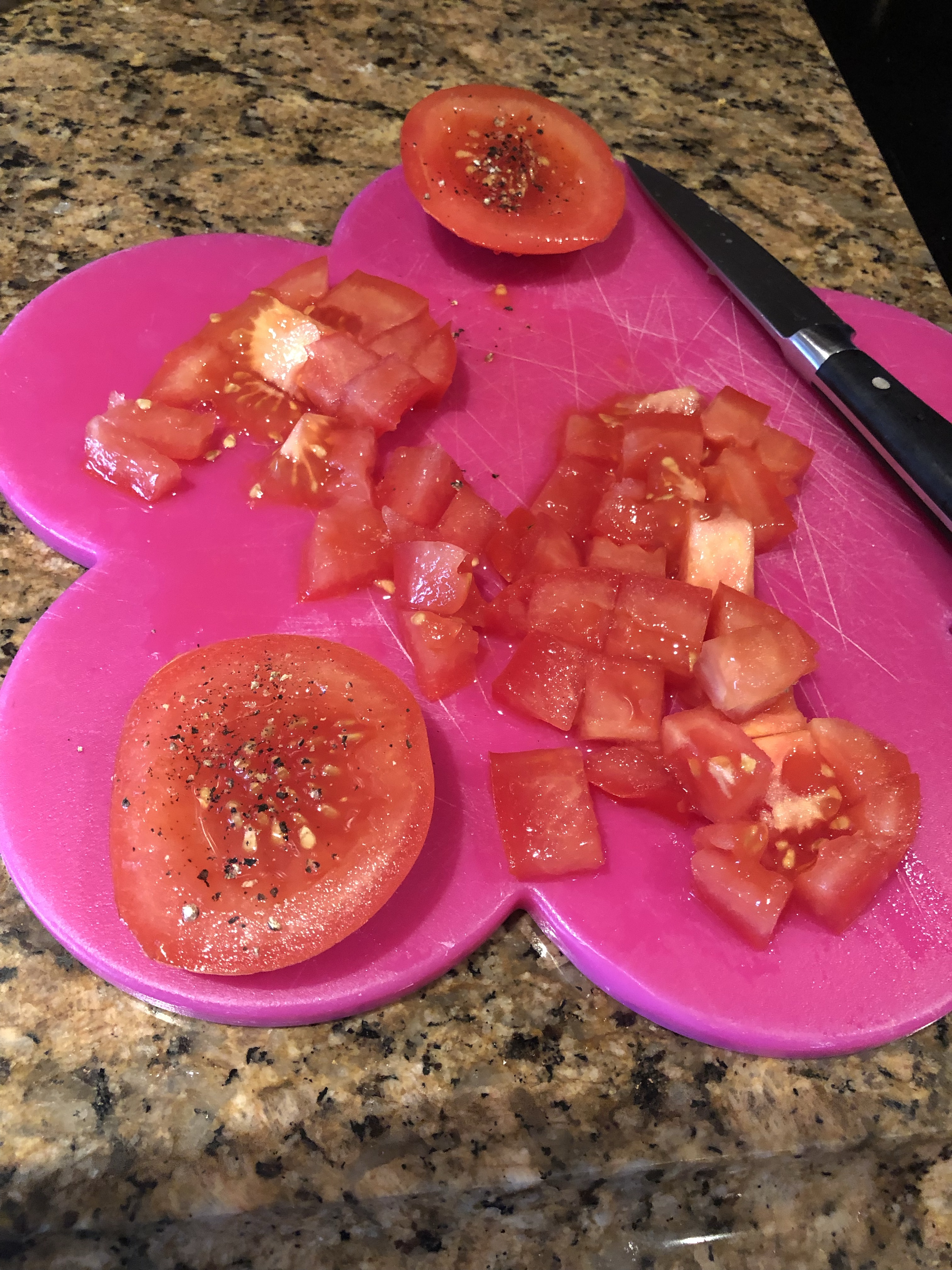 Chop the two tomatoes- and of course eat the ends with pepper. That’s a must or the recipe won’t turn out. Ok so not really – but it’s a good cooking snack!