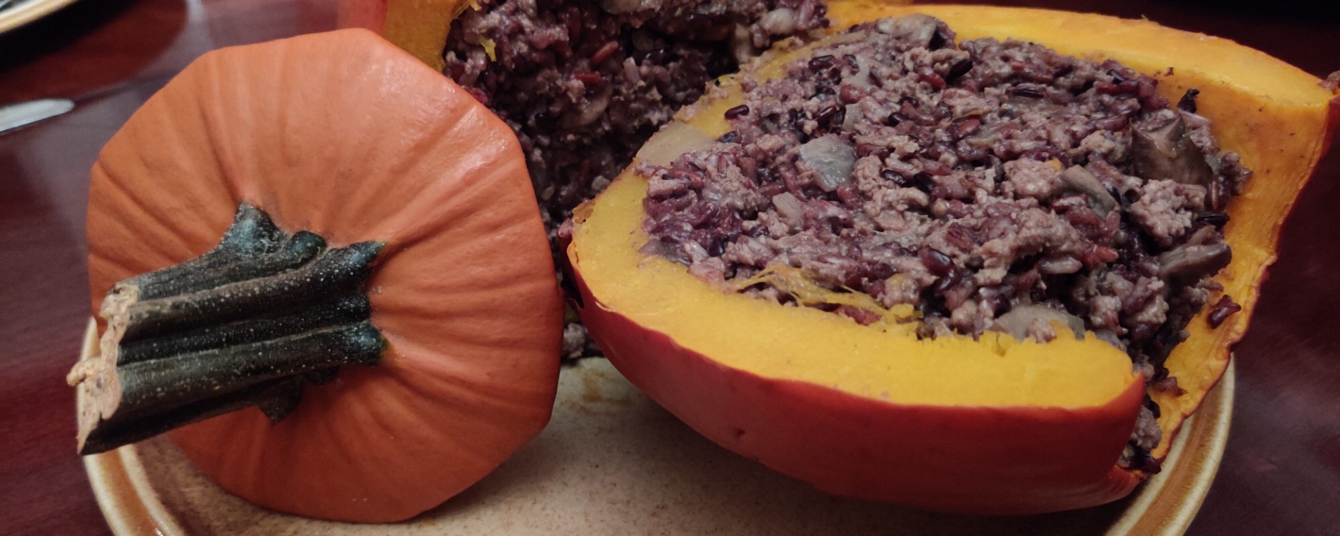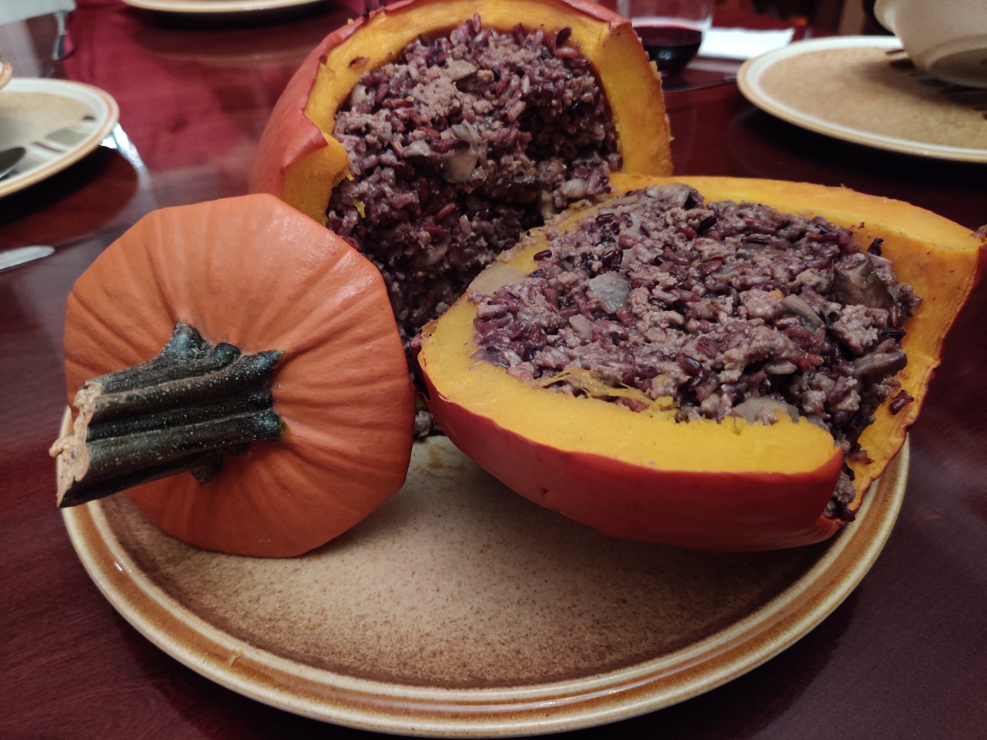 Slice like a cantaloupe and serve a ‘slice’ of pumpkin and filling – yum! I cut my stuffed pumpkin into about eighths.