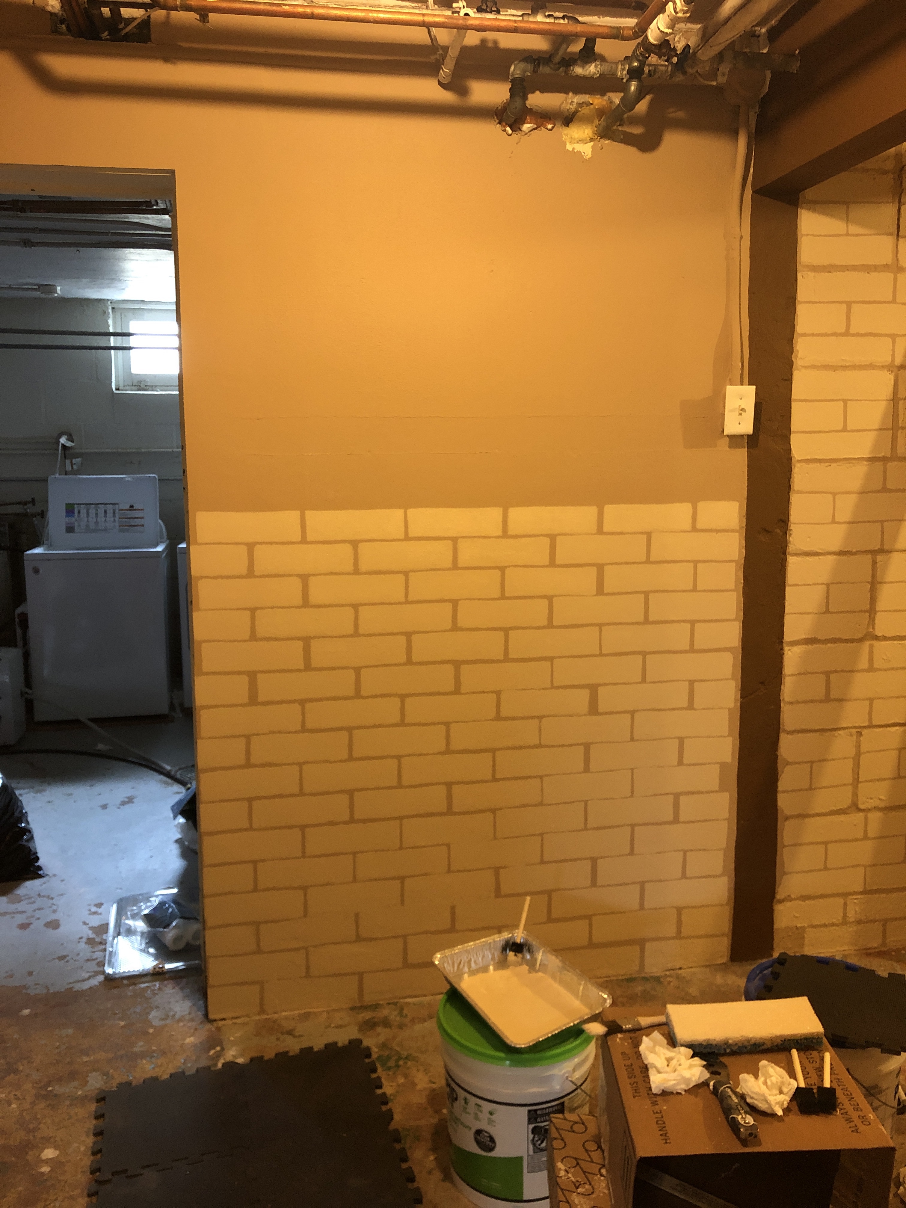To create our bricks- I am using a sponge mop head. It was ‘thin’ enough and longer than a typical sponge. For the smaller edge bricks- we cut a second mop head sponge in half. Then I bought a large lot of foam brushes to help fill in the bricks after stamped. We are filling ours solid – looks better than leaving them ‘spongey’ or a blended color like I tried at first.