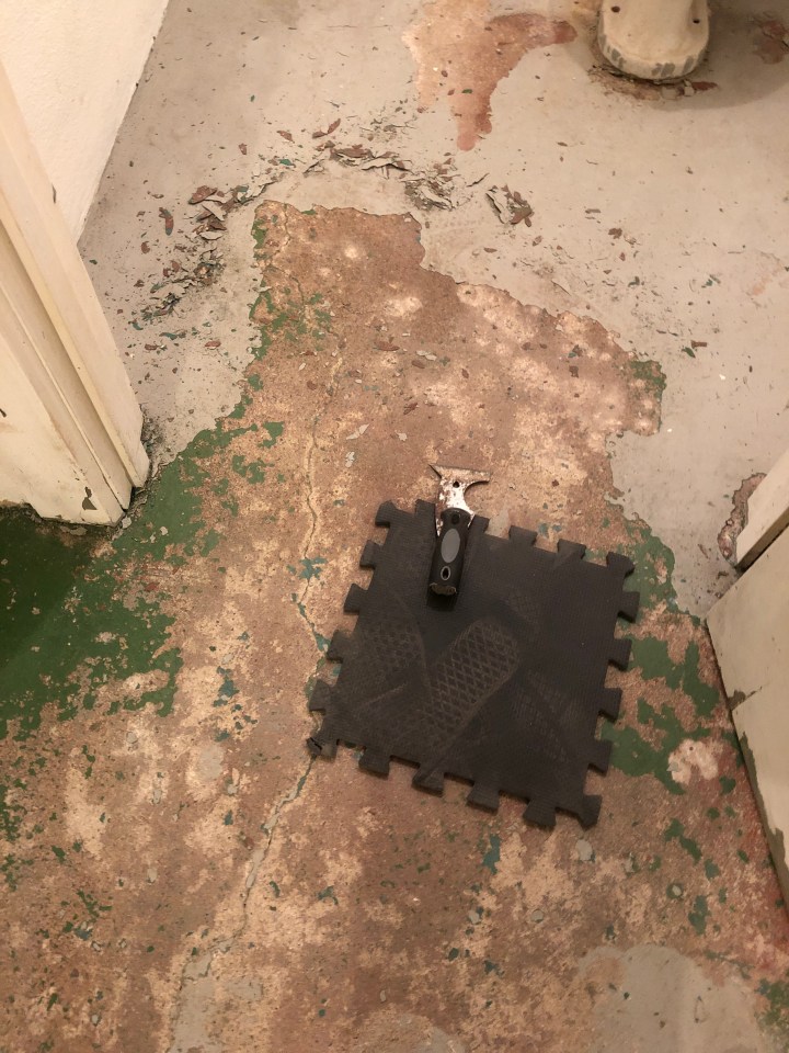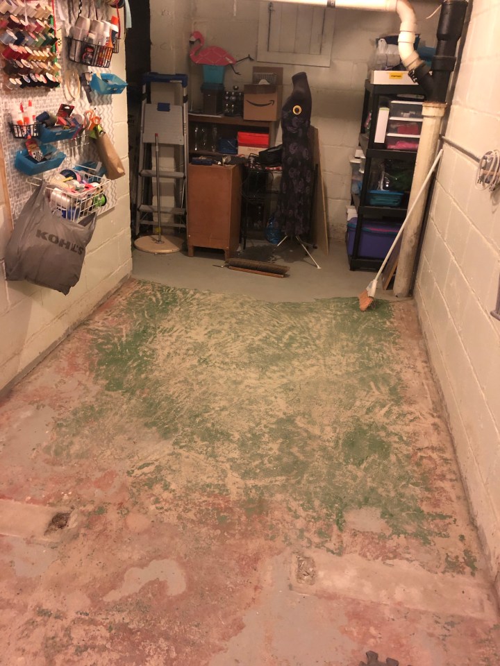 February we pressure washed the floor, there is a drain in the next room that we, as a team- one pressure washing the other sweeping, were able to direct the water to. Then we scraped again, and swept… we were ready to roll to painting. I admit I tried the pressure washing part by myself buying some rubber garage door barrier stuff as a spill blocker to dike for the water, but they were way to expensive on amazon so I tried the garage door seal strip.. but it didn’t work. I forgot how much the water splatters everywhere … from the PRESSURE part of pressure washing… the stairs were covered in little paint chips I had to sweep up after they dried. Once pressure washed we put the dehumidifier on at full blast and a big box fan on. Thankfully in winter the air in the house is so dry, that the water evaporated very quickly, quicker than I thought. I was hoping for a few day break!