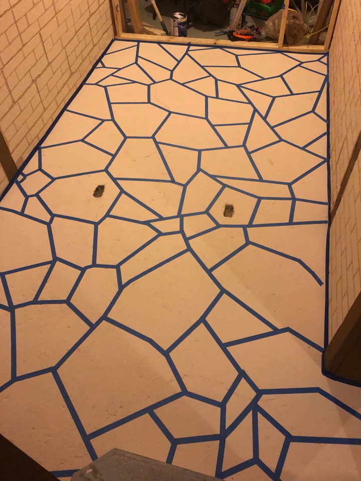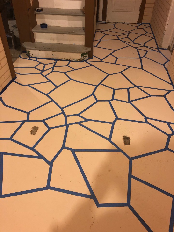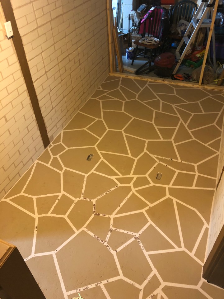 The fun part was taping the floor, I had some fun with that. I decided to just use painters tape and roll with it vs purchasing a cement pattern like so many other examples had used. I started in the corner by the bathroom since that would be seen ‘last’ as walking down the stairs and that pattern and I just clicked. I really like how it turned out, even with the blue tape it looked kinda cool hey?! This also made it super easy to then do the next part as we just plunk the solid color on top. I did have on me the other left over colors and TWO roller brushers so that the Canoe color wouldn’t get mixed in. I didn’t use a lot, but just a little bit of other color splattered on and rolled out to give the stones an ever slightly different shade thru-out. BE CAREFUL taking the tape off ☹ ours sadly took some of the paint off and I had to sit there with a little paint brush and redo a few spots. Not sure why this happened, we let the floor dry long enough before putting down the tape. Best guess from the fake hubby is that we left the tape there for a little over a week. We should have just taped it Friday, painted it Saturday, and removed the tape Sunday… bing bang boom. Needless to say I purchased, and thank Amazon for one day shipping, some hobby paintbrushes, kinda the childrens’ style but a quarter inch wide brush. Not the typical paint by number water color style brush. For one day shipping I had to buy, more than I needed (a pack of 50), but it was only like 2 or 3 bucks more than a smaller pack and beat the shipping… so if anyone needs some paint brushes… you know who to ask, I may have a few to spare, haha. you can just see the grout lines below. Sad sad.