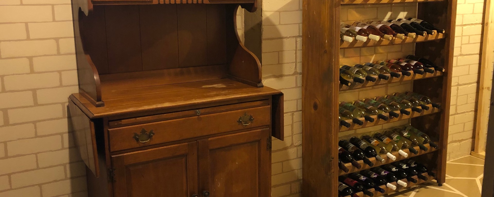Alas the walls – complete, the floors thank god complete, stenchy stuff and all – done! the trim- done… I finally moved the wine rack we had into the room and the hutch (actually a week and a half ago already). The hutch will STAY, but the wine rack –prolly not. The fake hubby will cut a custom wine rack for the opposite wall. It will have ‘boxes’ with an X in the middle, I am sure ya’ll have seen those at restaurants or the fancier wine shops. Each portion of the X would hold say 6 bottles (3, 2, 1 in a pyramid) this each ‘box’ would hold 24 bottles… I think three or 4 of those on the bottom, then a few rows similar to the existing wine rack where they have individually grooves for its butt and bottle neck. One of these was already started. We went to Mom’s and G&G’s and Buppa and the fake hubby measured and started one row. I will need to stain them once cut and then the fun assembly and affixing to the wall for full support! I can’t wait, but until then, I am happy with what I have. One of these rainy weekend days we’ll work on the wine racks, until then its way to much fun to be outside.
